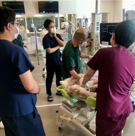 小児科は伝統的に屋根瓦方式の教育体制を取っており、若手専攻医を2,3年目の専攻医が指導し、さらにスタッフが指導するという形です。ほぼ毎日カンファレンスで、情報や問題点の共有や治療方針の検討を行い、専攻医が不安なく診療できるような体制を取っています。また、重症な患児が入院した際には科内一丸となって診療に当たる事もあります。
