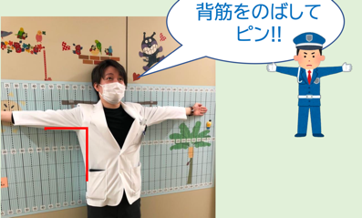 小児科外来にあるアームスパンを測定するための壁紙です。通常は身長と概ね同じ長さですが、骨系統疾患や放射線治療で脊椎に照射を受けた方は、アームスパンと身長が異なる場合があるので時々外来で測定しています!