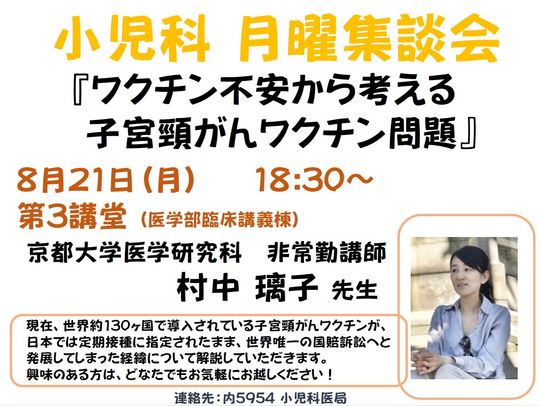現在、世界約130ヶ国で導入されている子宮頸がんワクチンが、 日本では定期接種に指定されたまま、世界唯一の国賠訴訟へと 発展してしまった経緯について解説していただきます。 興味のある方は、どなたでもお気軽にお越しください!