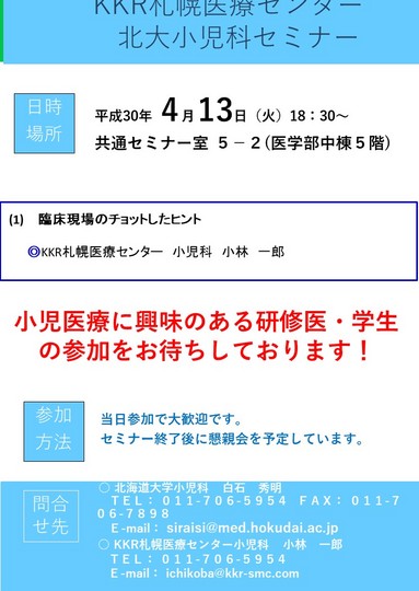 小児科セミナーを開催します。 小児科に興味のある方はお気軽にご参加ください。 日時 2018年4月13日(火)18:30~ 場所 共通セミナー室 5-2(医学部中棟5階) 詳しくはこちらをご覧ください。